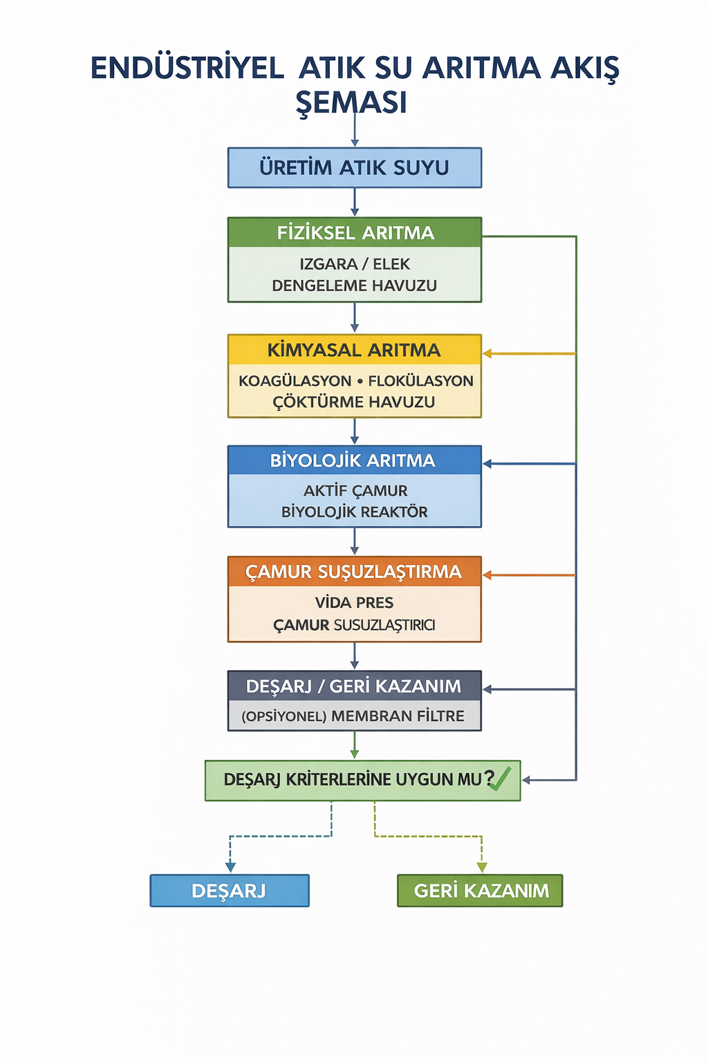 Endüstriyel arıtma sistemleri genellikle birden fazla aşamadan oluşur. Bu aşamalar atık suyun karakterine göre şekillenir.